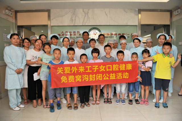 为什么会组织面对外来工子女的免费“窝沟封闭”活动,口腔医院牙体牙髓第二党支部书记刘河娣介绍说,“窝沟封闭”是世界卫生组织在全球推荐的预防儿童窝沟龋的有效措施。从2011年开始,由政府财政拨专项经费,启动了儿童“六龄牙”免费窝沟封闭项目。然而,目前来穗务工的子女中很多未享受到这些惠民政策,这些孩子是龋病发生的好发人群。暑假到来之际,这些“小候鸟”们跟随父母的脚步来到广州。我们牙体牙髓第二党支部结合这一实际,将“两学一做”学习教育活动与科室的业务工作深度融合,利用医生党员的专业特长服务社会,宣传牙齿保健的知识,普及窝沟封闭的重要性,更好地为广大儿童服务。