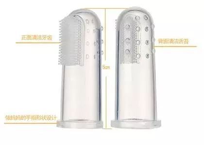 ②硅胶手指牙刷:在宝宝长牙前和长牙初期,妈妈可使用硅胶手指牙刷给宝宝来清洁口腔。婴儿专用手指牙刷一般由食品级硅胶原料制成,顶端一面是柔软的硅胶刷头,另一面是用于清洁舌苔的圆形小凸点,整体圆滑柔软,不会伤及宝宝娇嫩的口腔内壁。在使用手指牙刷前,要先对牙刷进行消毒,放入沸水中煮3~5分钟即可;清洁时准备一碗温开水,让宝宝躺在怀里,一手扶住宝宝头部,一手套上手指牙刷蘸清水清洁宝宝口腔,刷头清洁牙齿,凸点清洁舌头,要注意清洁牙齿间的缝隙处。