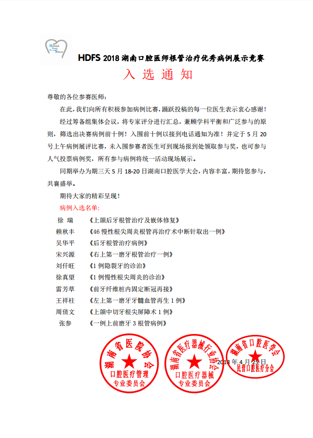【入选通知】祝贺前十位优秀医师入选HDFS湖南根管治疗优秀病例竞赛