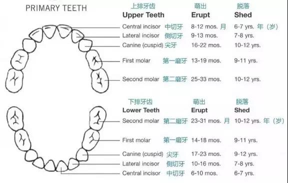 大多数情况下,乳牙会依照中切牙、侧切牙、第一磨牙、尖牙、第二磨牙的顺序萌出。换牙脱落的顺序也是如此
